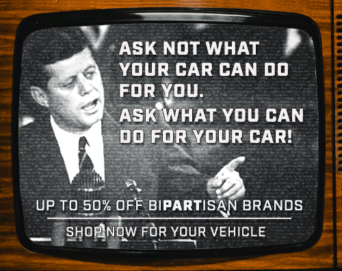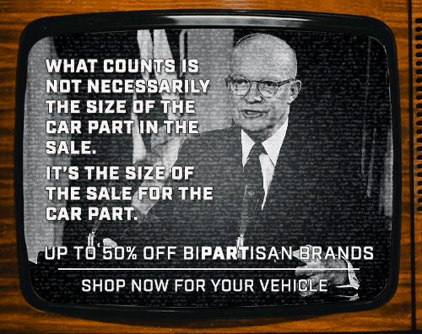 For the design, I wanted to emulate a tv broadcast from around the time these presidents were in office. After finding a tv box frame from that era photoshopped in a picture of JFK and Ike and an altered car enthusiast version of a famous quote from each of them. The reason I chose to make variations is that the sale ran for more than a week and we wanted to make sure that the visuals didn't become stale in the viewer's eyes.